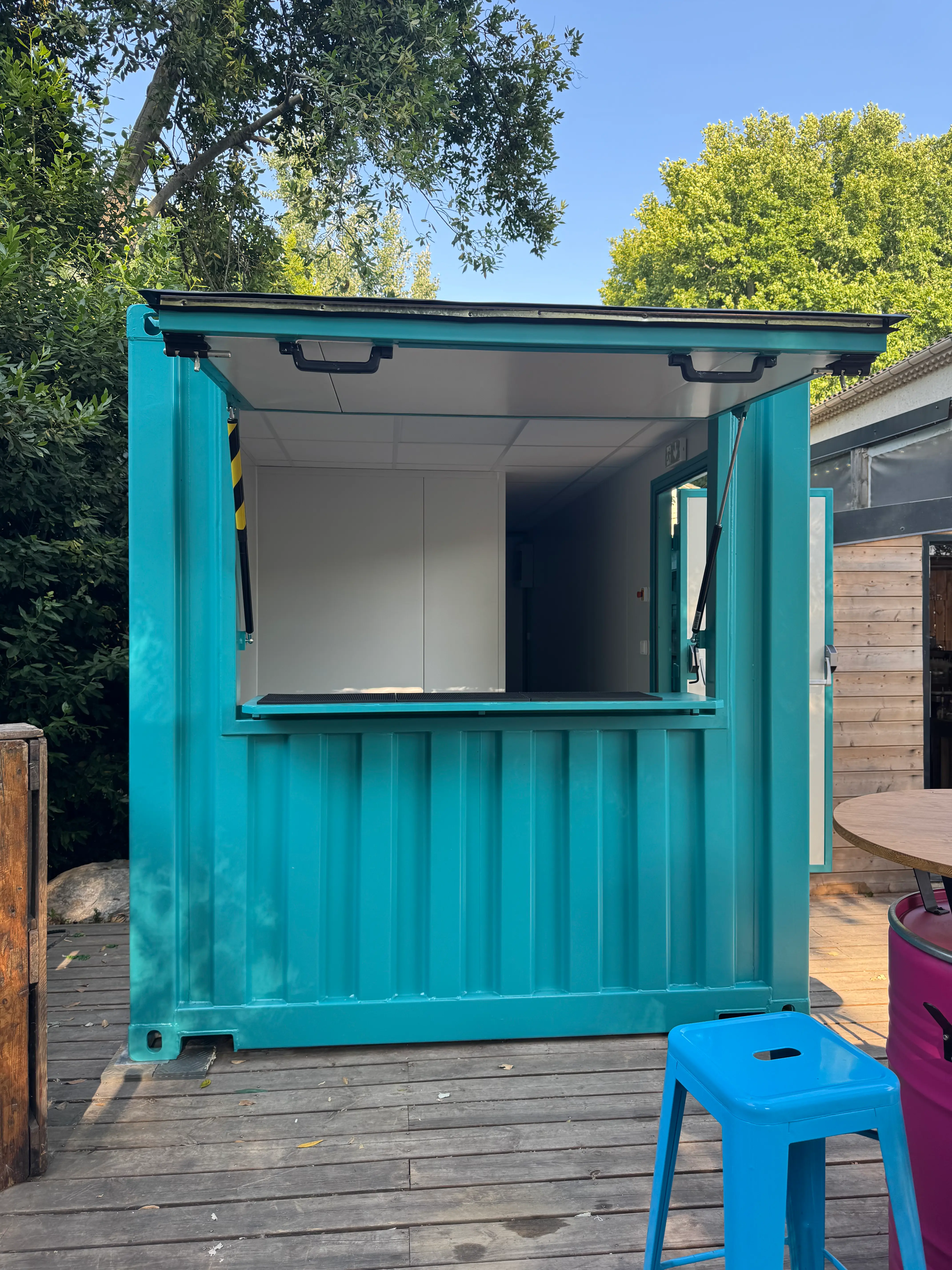 Le bar en container est équipé d’un auvent et d’un comptoir extérieur, facilitant le service au public et améliorant la circulation des clients. Cet aménagement crée une zone de vente fonctionnelle et adaptée à une utilisation quotidienne.