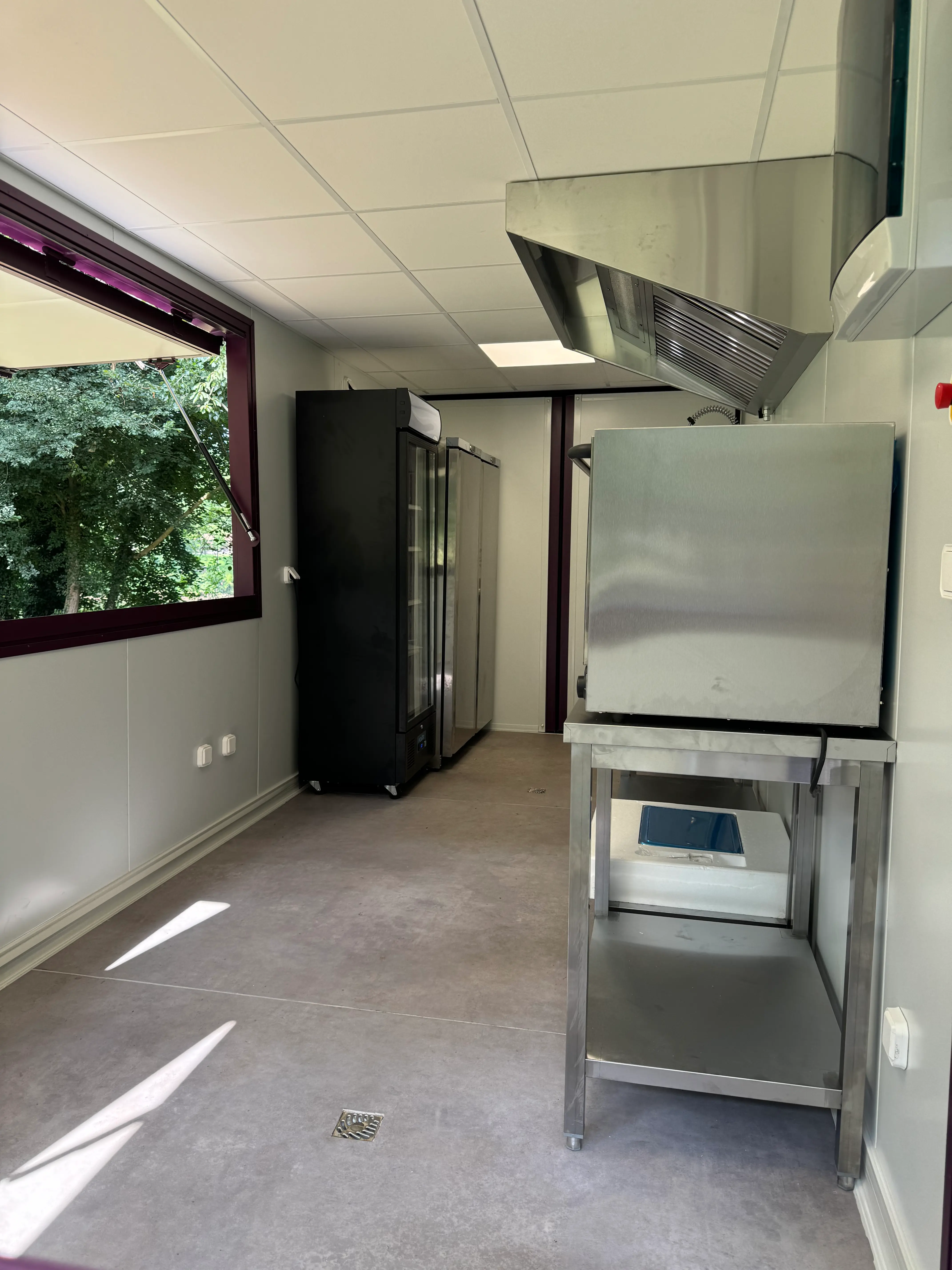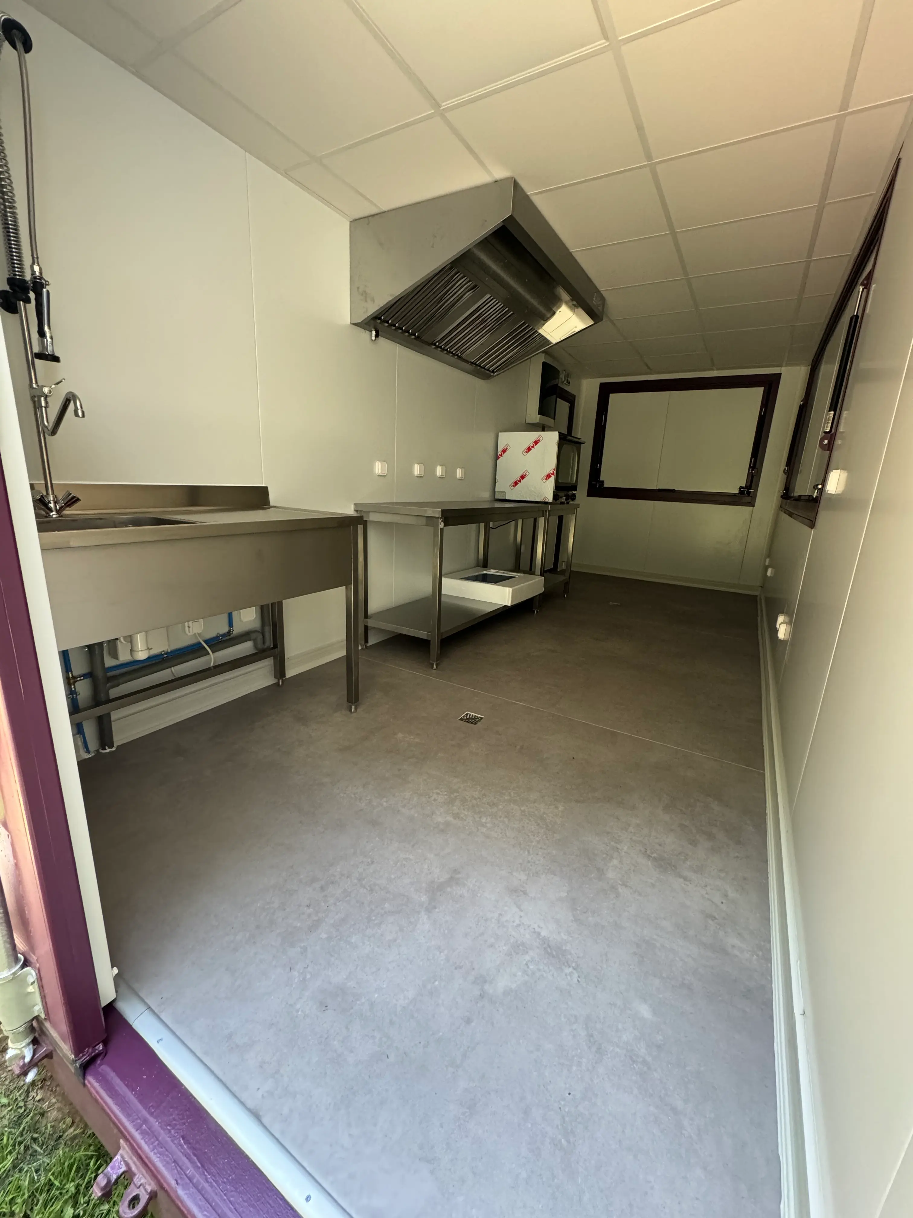 L’intérieur du container a été entièrement aménagé pour répondre aux besoins d’un snack. L’isolation par panneaux sandwich garantit un confort thermique adapté à une utilisation quotidienne. Le sol en lino, choisi pour sa facilité d’entretien, convient parfaitement à un usage alimentaire. Les équipements intérieurs, comprenant notamment une hotte et une table en inox, permettent une préparation des produits dans de bonnes conditions d’hygiène et de fonctionnalité.