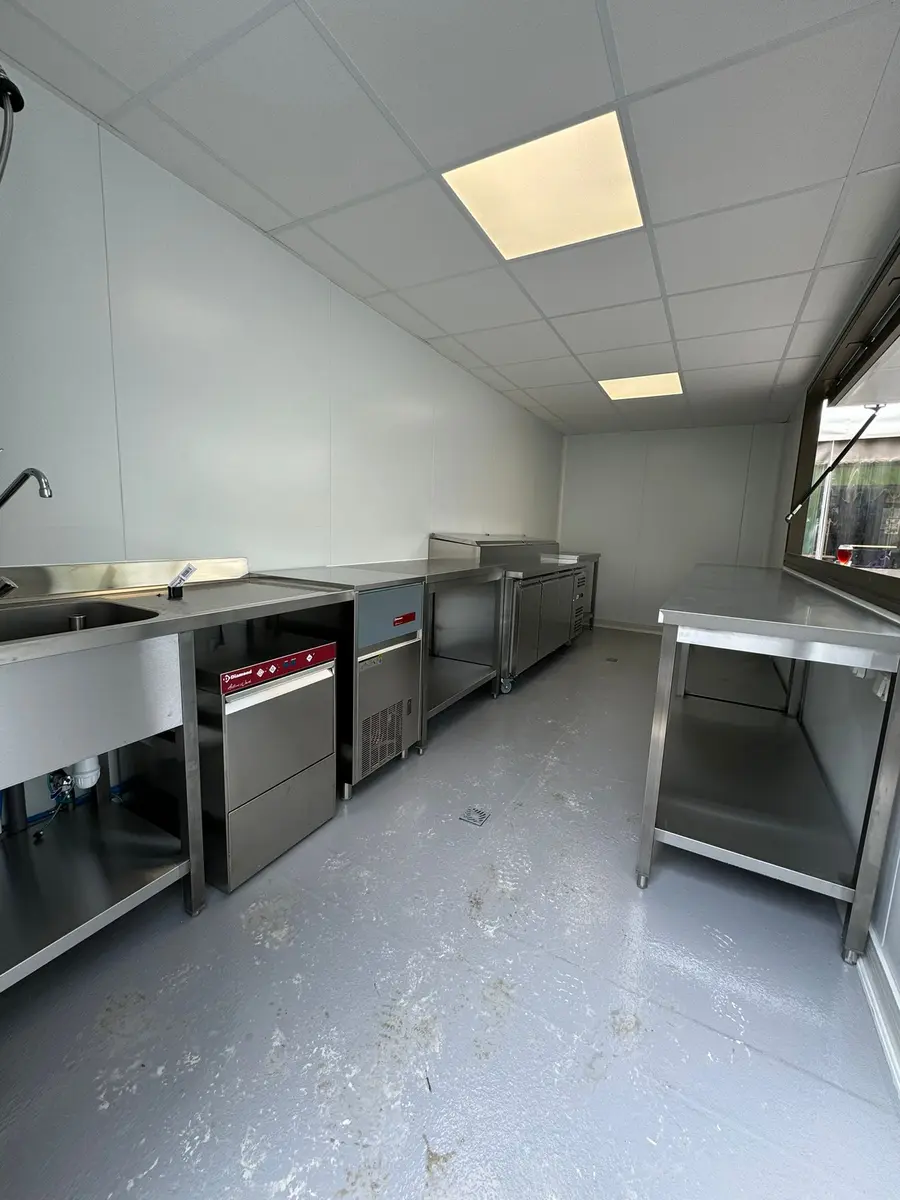 Electroménager : Dans cette configuration, nous avons inclus une plonge ainsi qu’un lave-verre avec une salopette, accompagnée de plusieurs tables en inox pour multiplier les plans de travail.