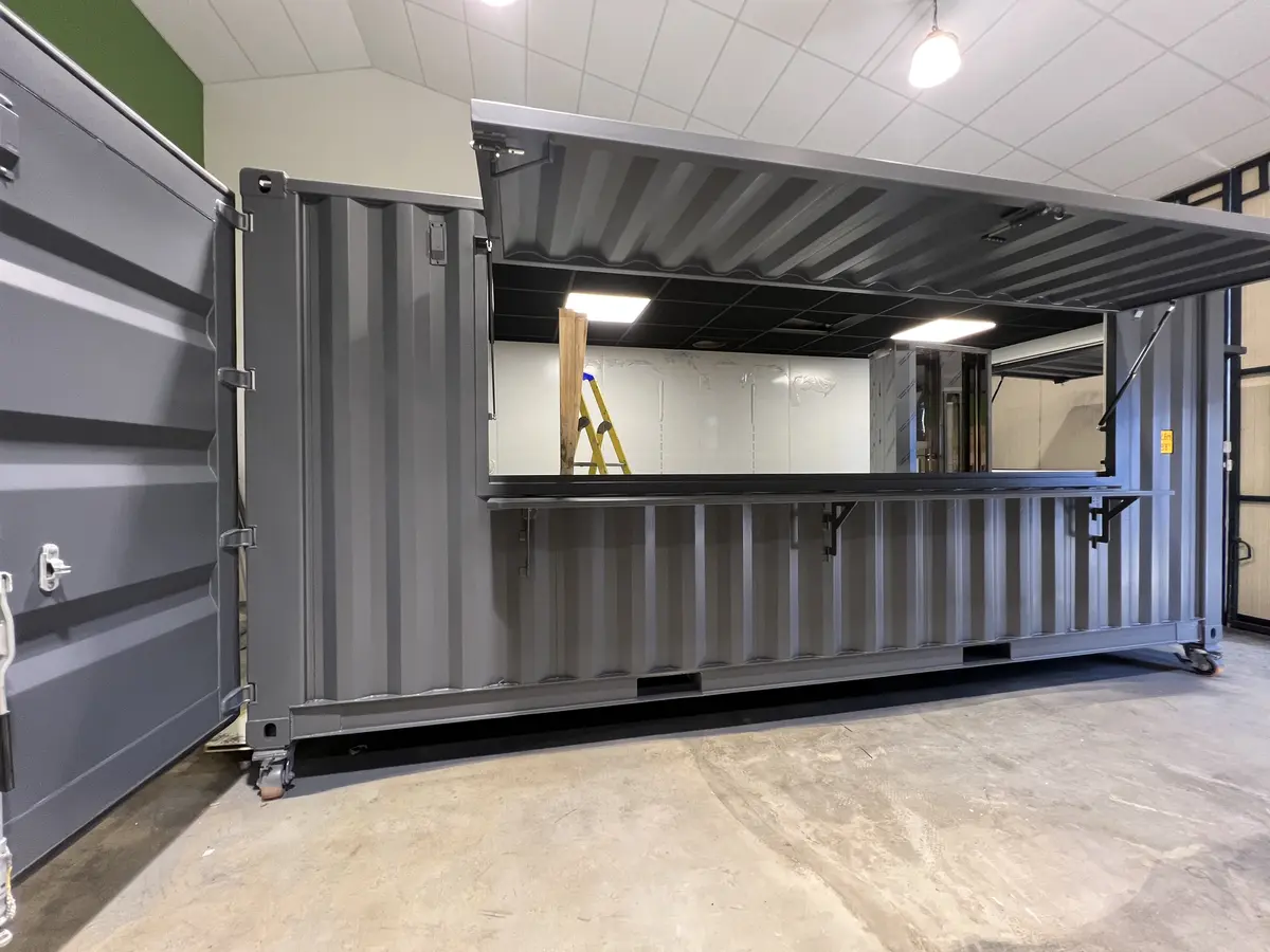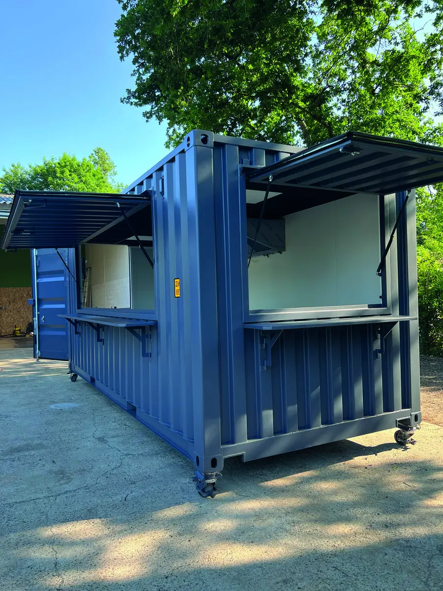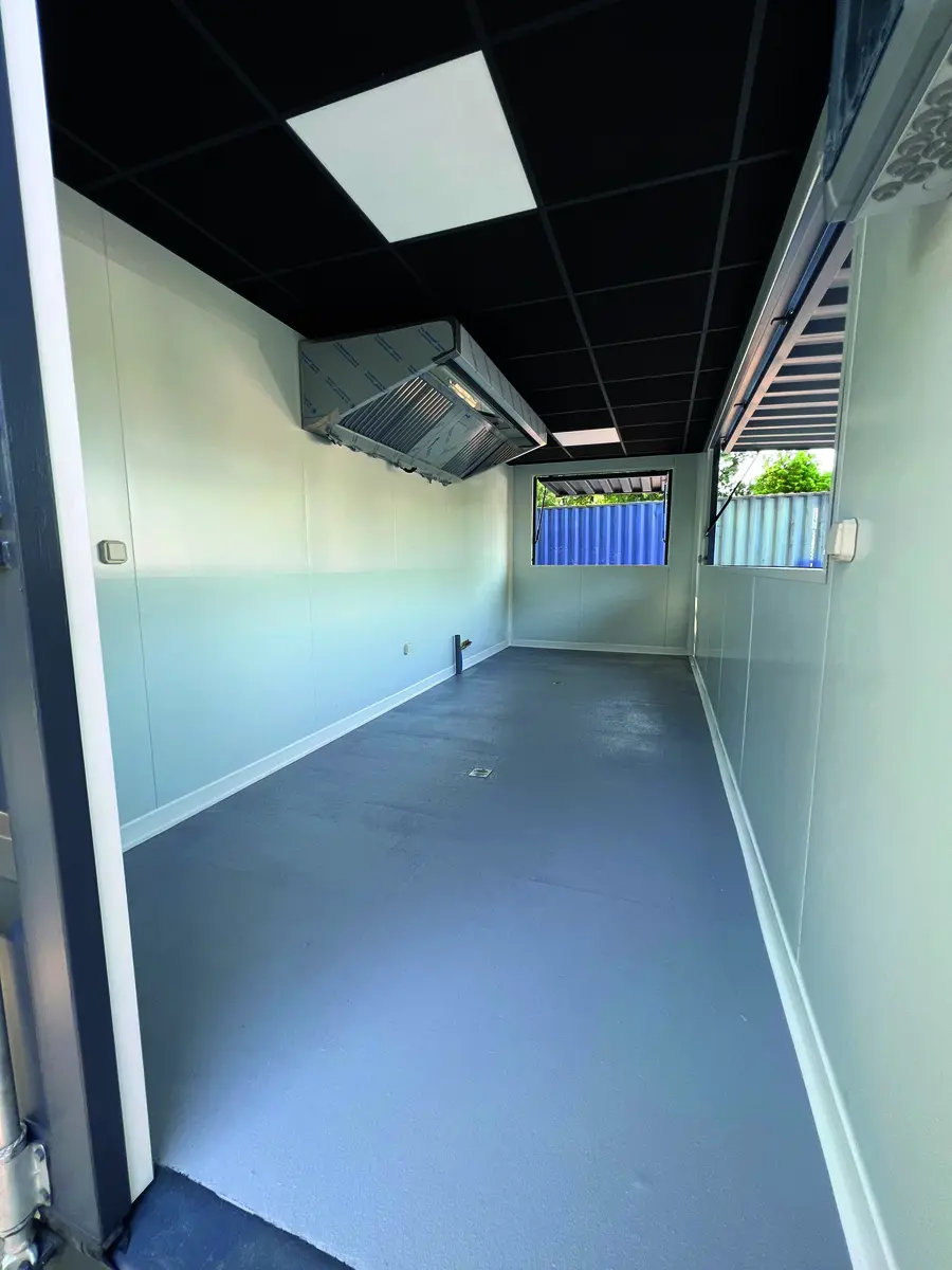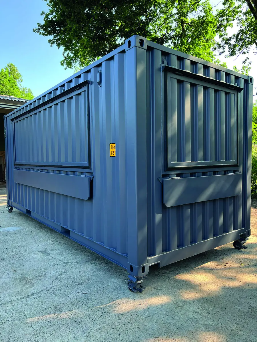 Container 20' : Nous avons transformé un container de 20' (6.05x2.44x2.59m) standard en un espace fonctionnel pour votre snack. Les portes d'entrée du container fournissent un accès facile et pratique pour le personnel.