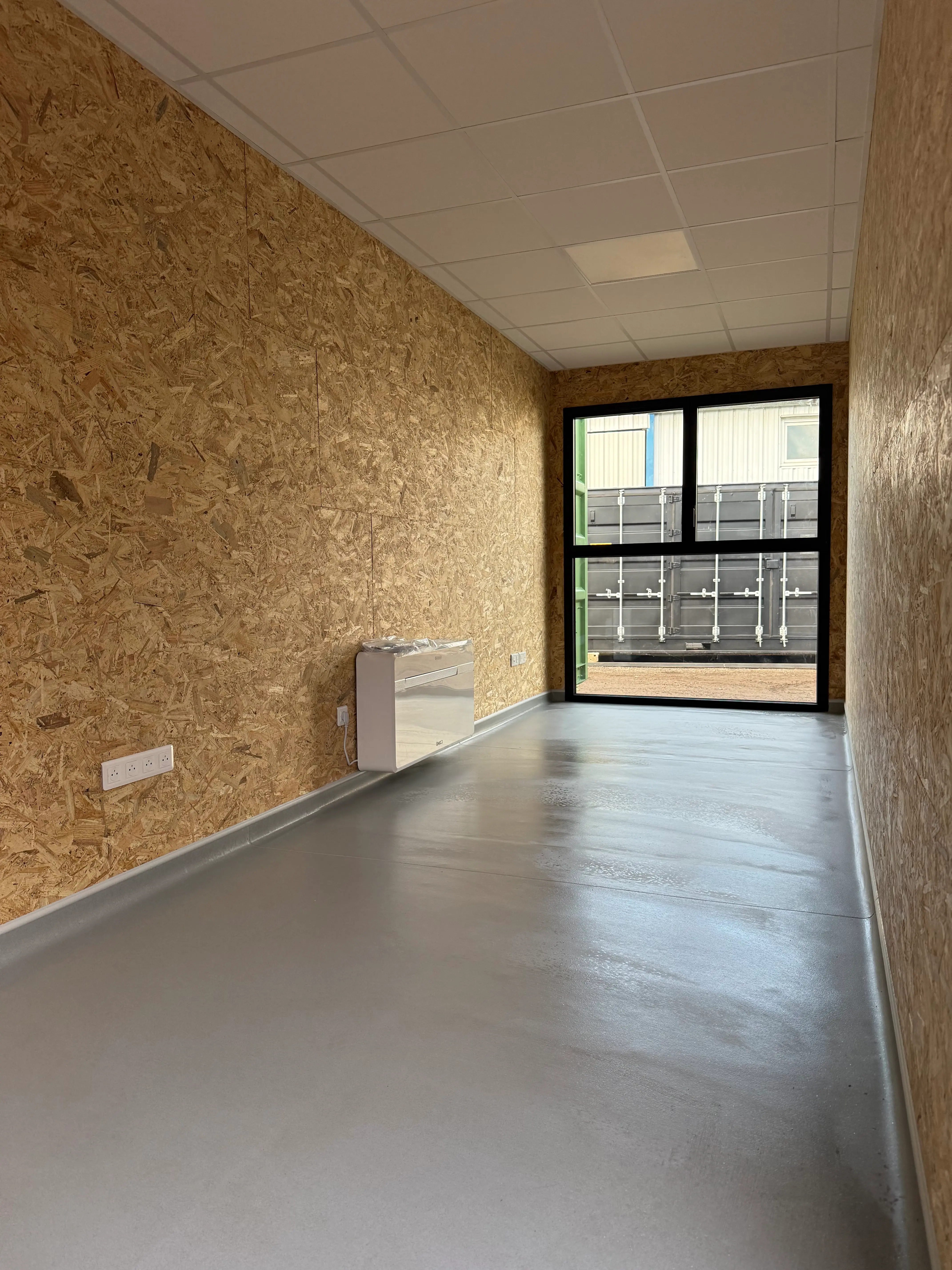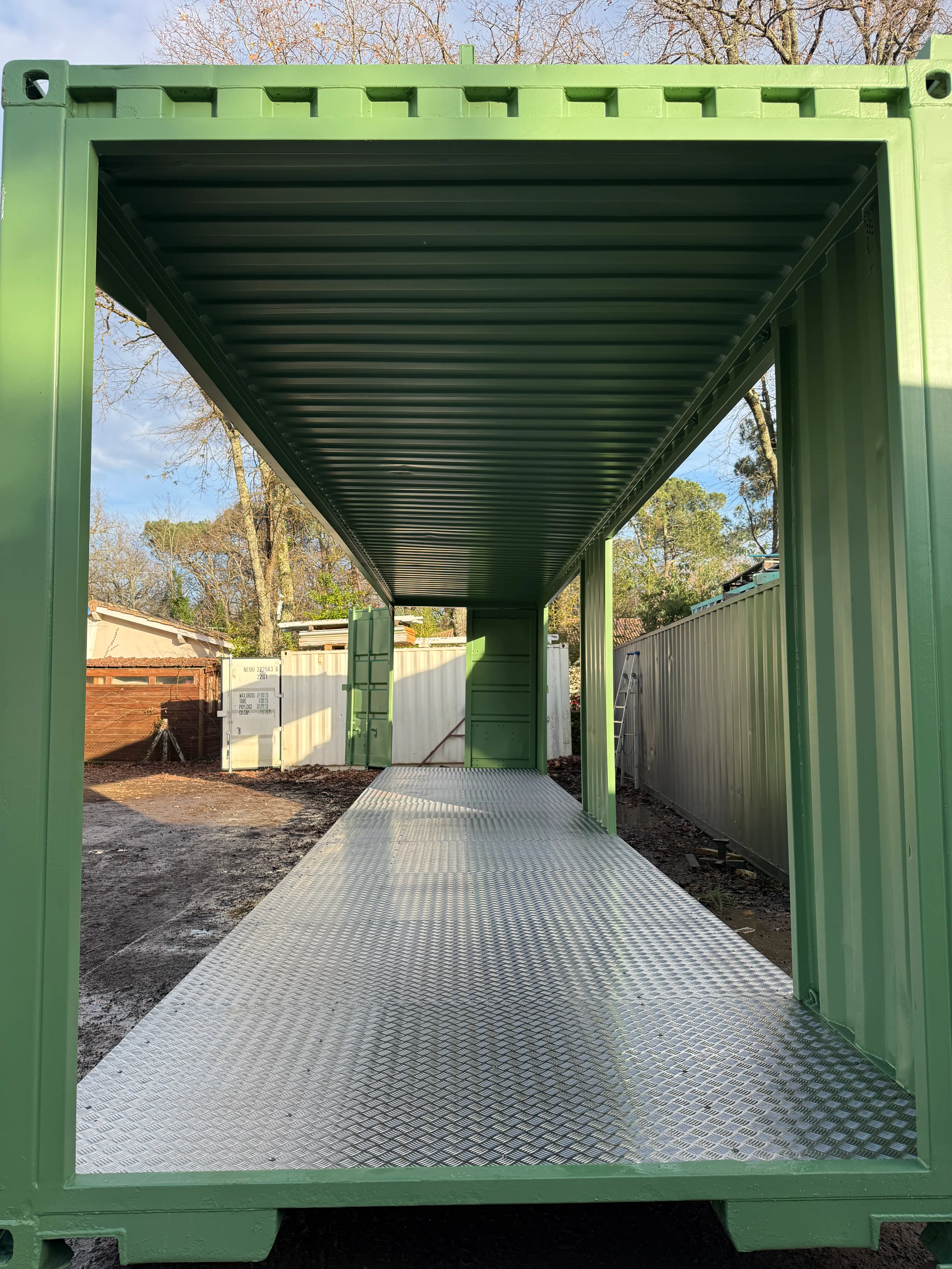 Container dédié à la terrasse : L’un des deux containers a été entièrement pensé comme un espace ouvert sur l’extérieur. Nous avons réalisé une ouverture complète des façades favorisant la convivialité et l’accessibilité du lieu. Le sol de la terrasse est habillé de plaques en tôles larmées en acier, offrant à la fois résistance, sécurité et facilité d’entretien.