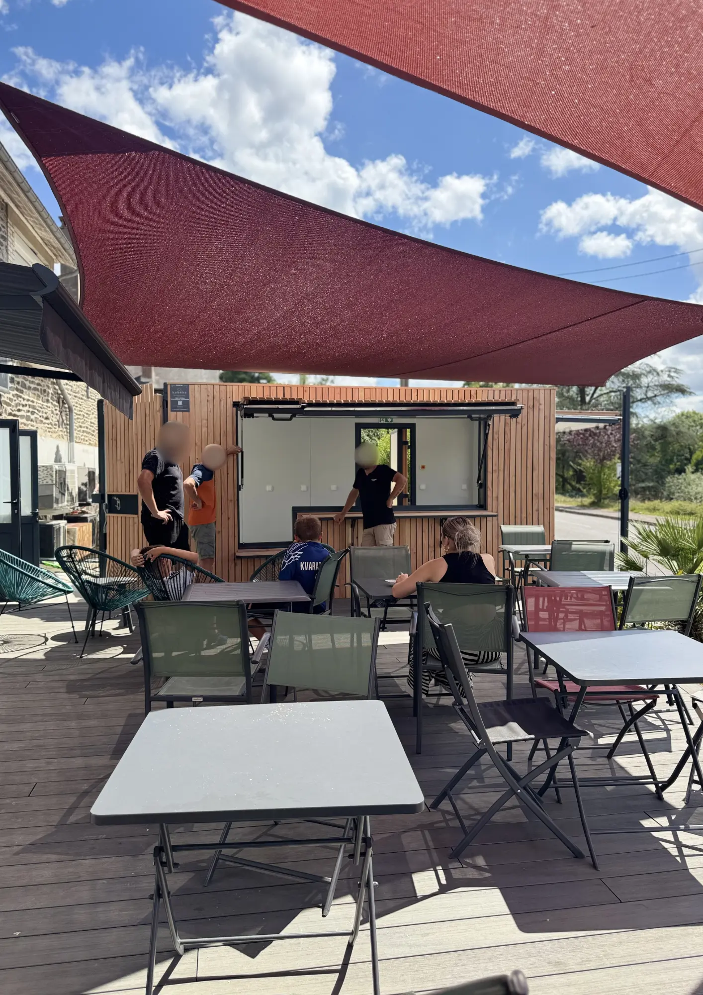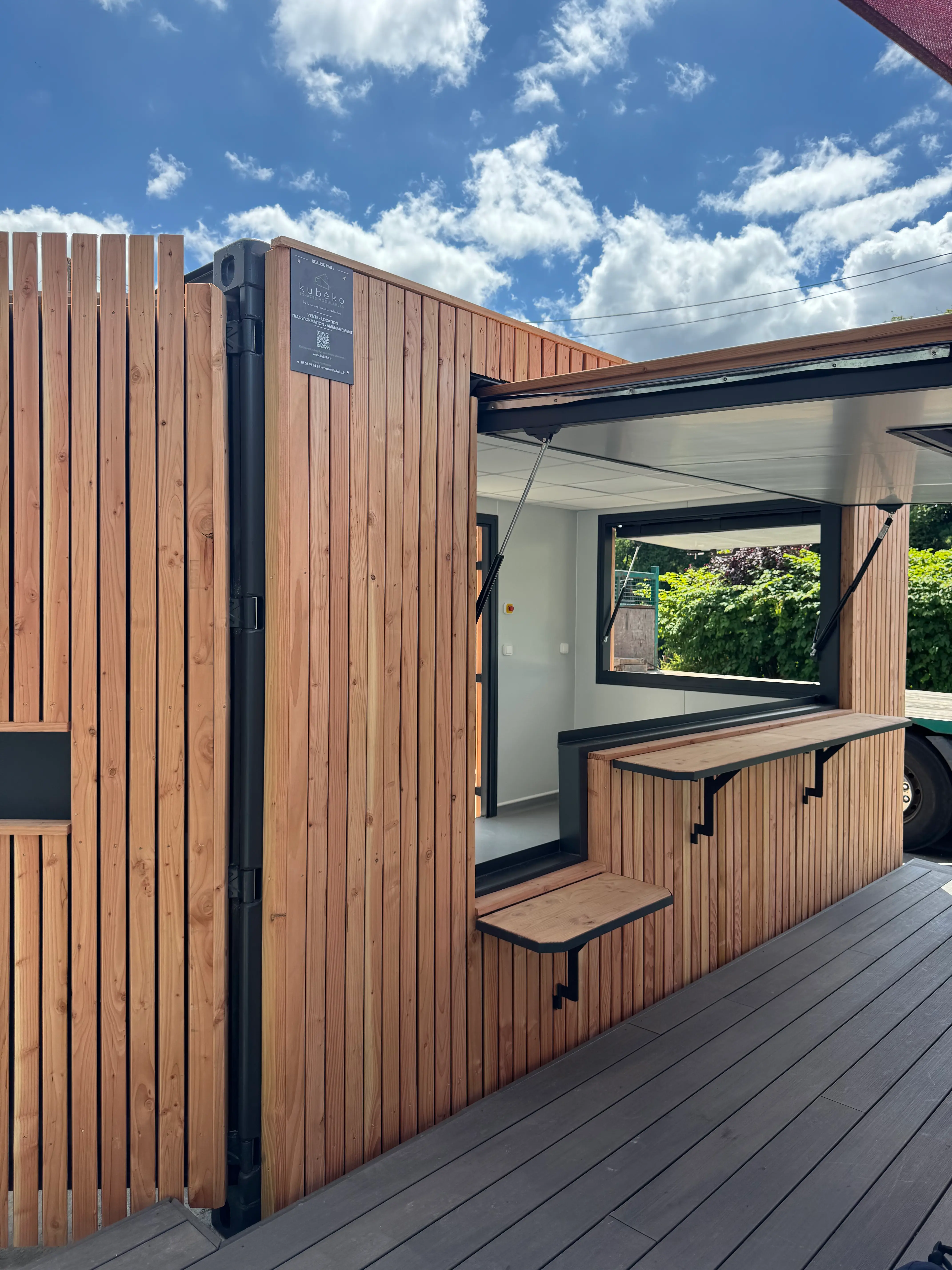 L’extérieur du container a bénéficié d’une peinture soignée, associée à un bardage bois qui apporte une touche chaleureuse et naturelle. Cette combinaison de finitions permet de créer une identité visuelle attractive, tout en intégrant harmonieusement l’espace de snack dans son environnement.