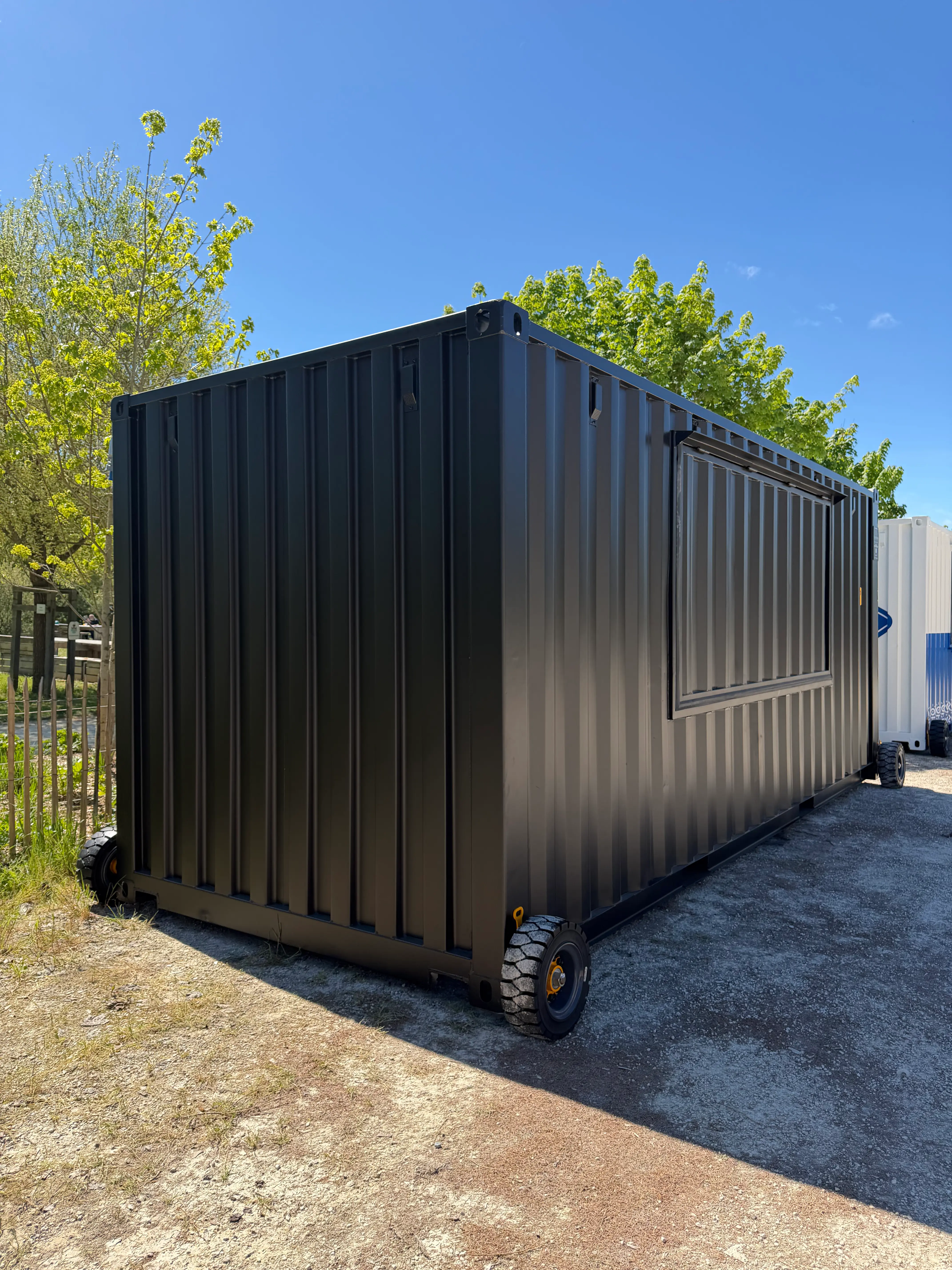 Chaque snack présente une finition extérieure personnalisée avec une peinture deux couleurs. Pour renforcer leur visibilité et leur identité, l’un des containers a reçu un habillage adhésif, tandis que l’autre se distingue par des choix de couleurs variés, notamment en blanc et bleu, ainsi qu’en noir avec le toit blanc. Ces finitions permettent de créer des espaces cohérents avec l’image de chaque activité.