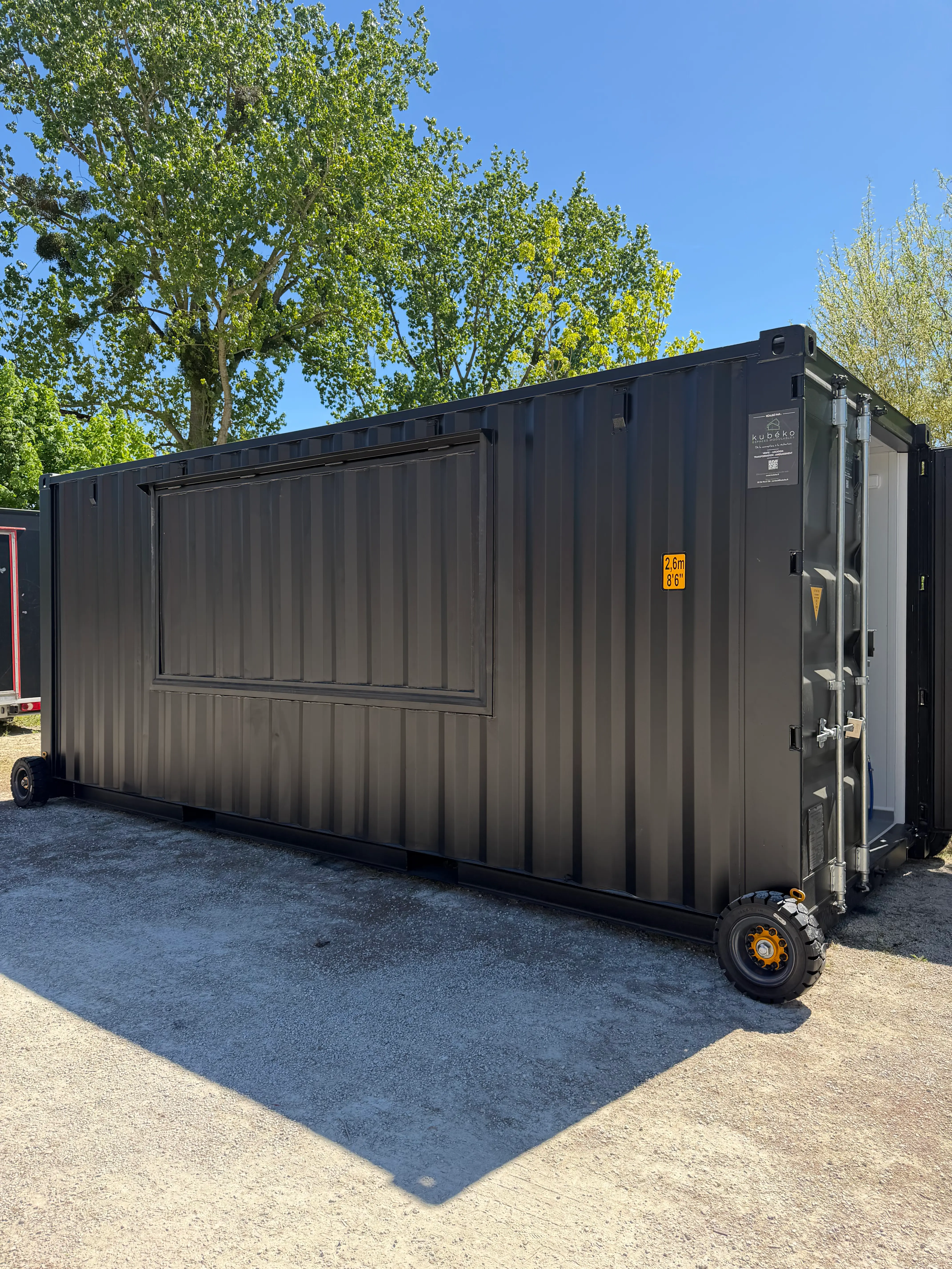 L’aménagement intérieur a été conçu pour un usage professionnel. L’isolation en panneaux sandwich améliore le confort thermique. De plus, le sol en lino apporte une finition propre et simple à entretenir. Un pack complet électricité et plomberie a été installé pour répondre aux besoins techniques du snack. Enfin, une ouverture spécifique a été réalisée pour intégrer une hotte et permettre l’utilisation d’équipements de cuisson.