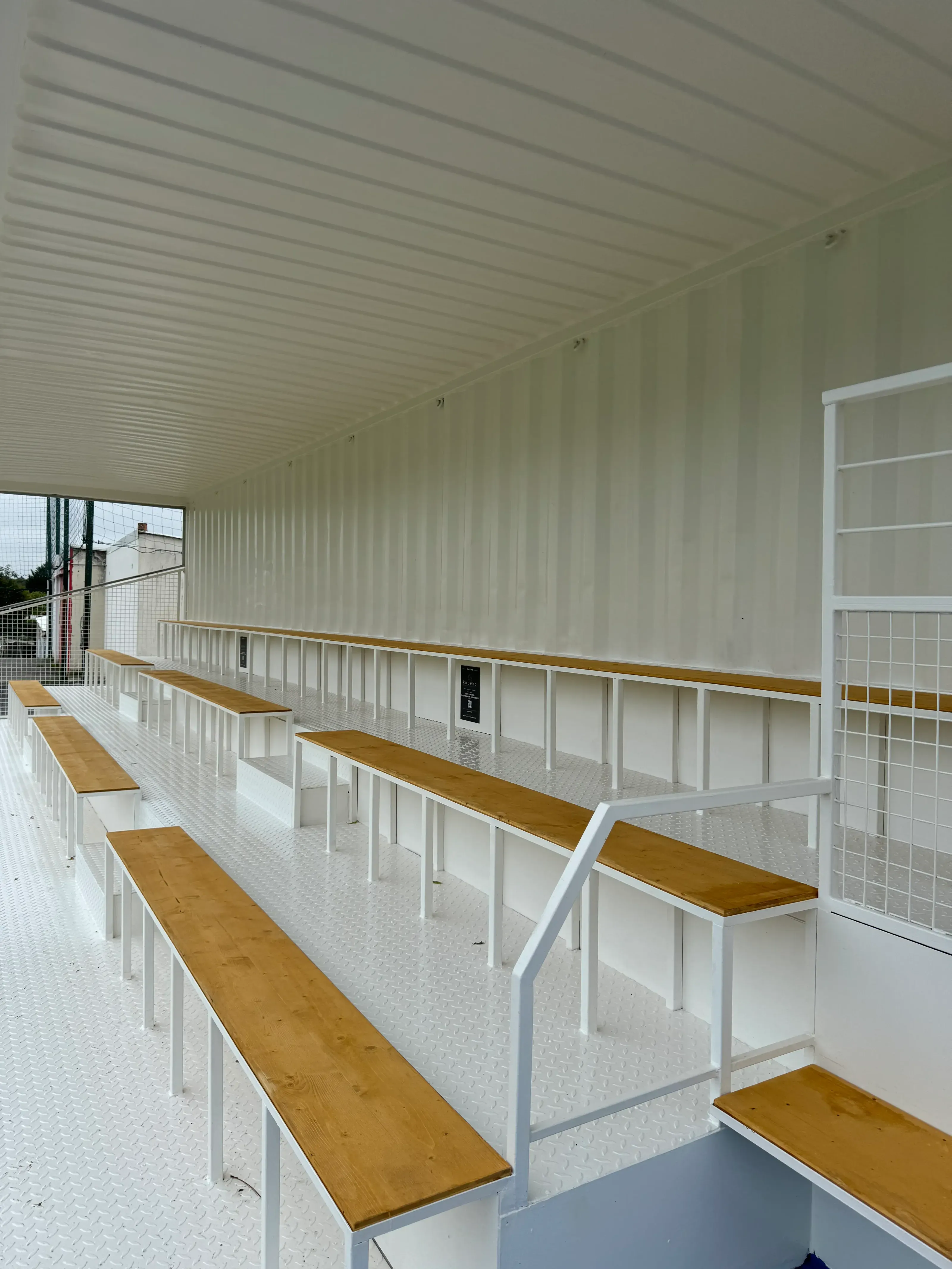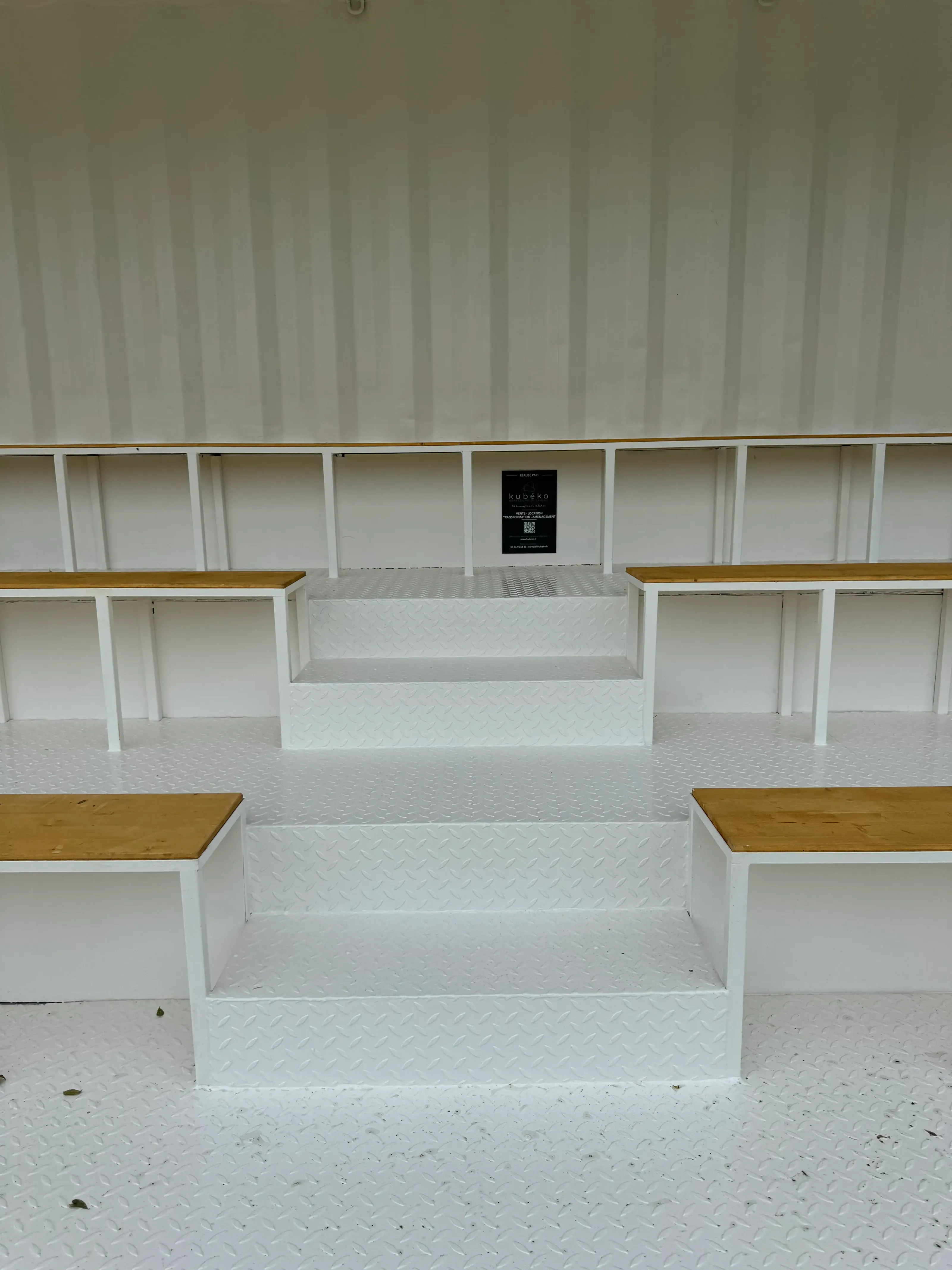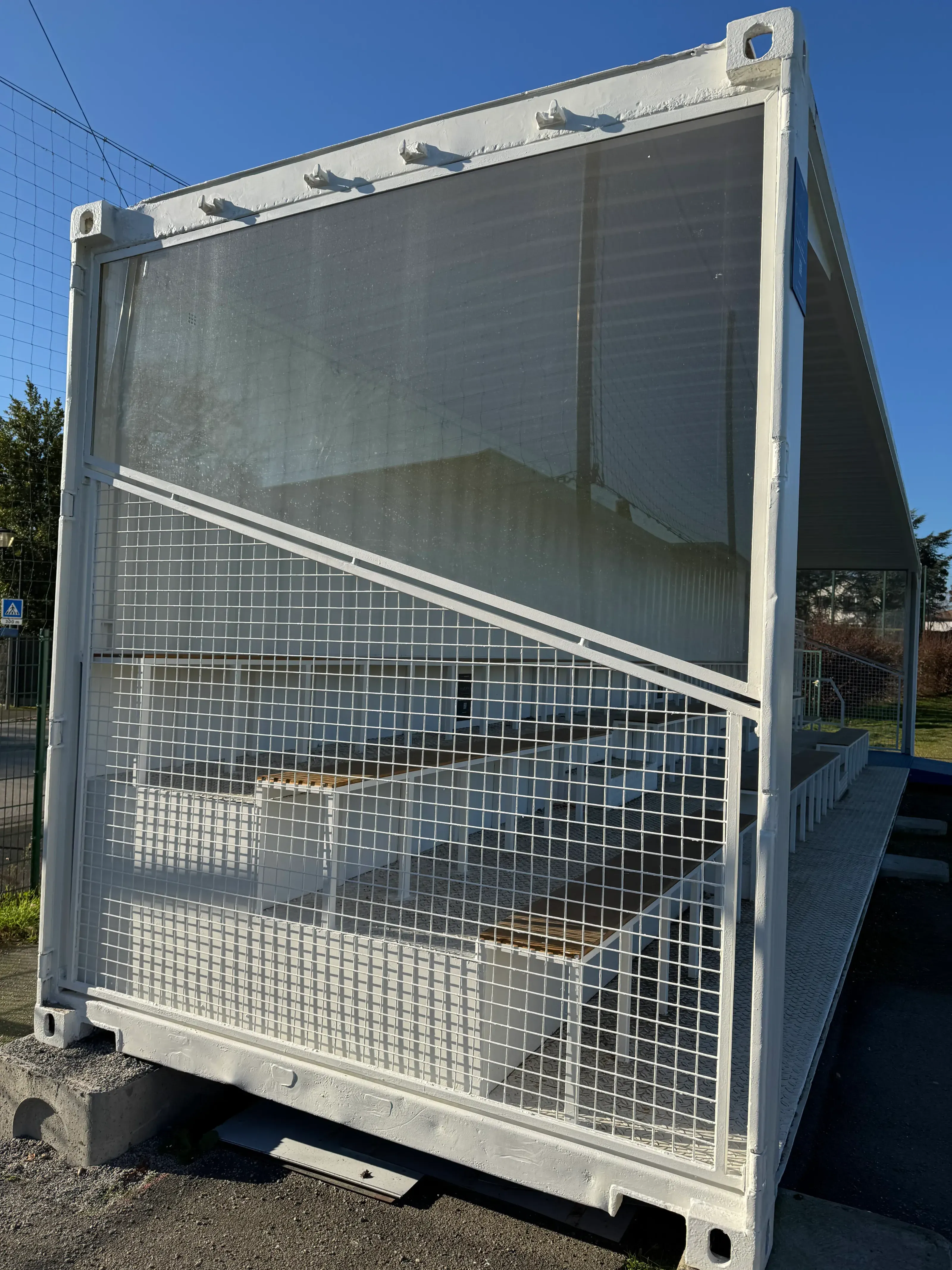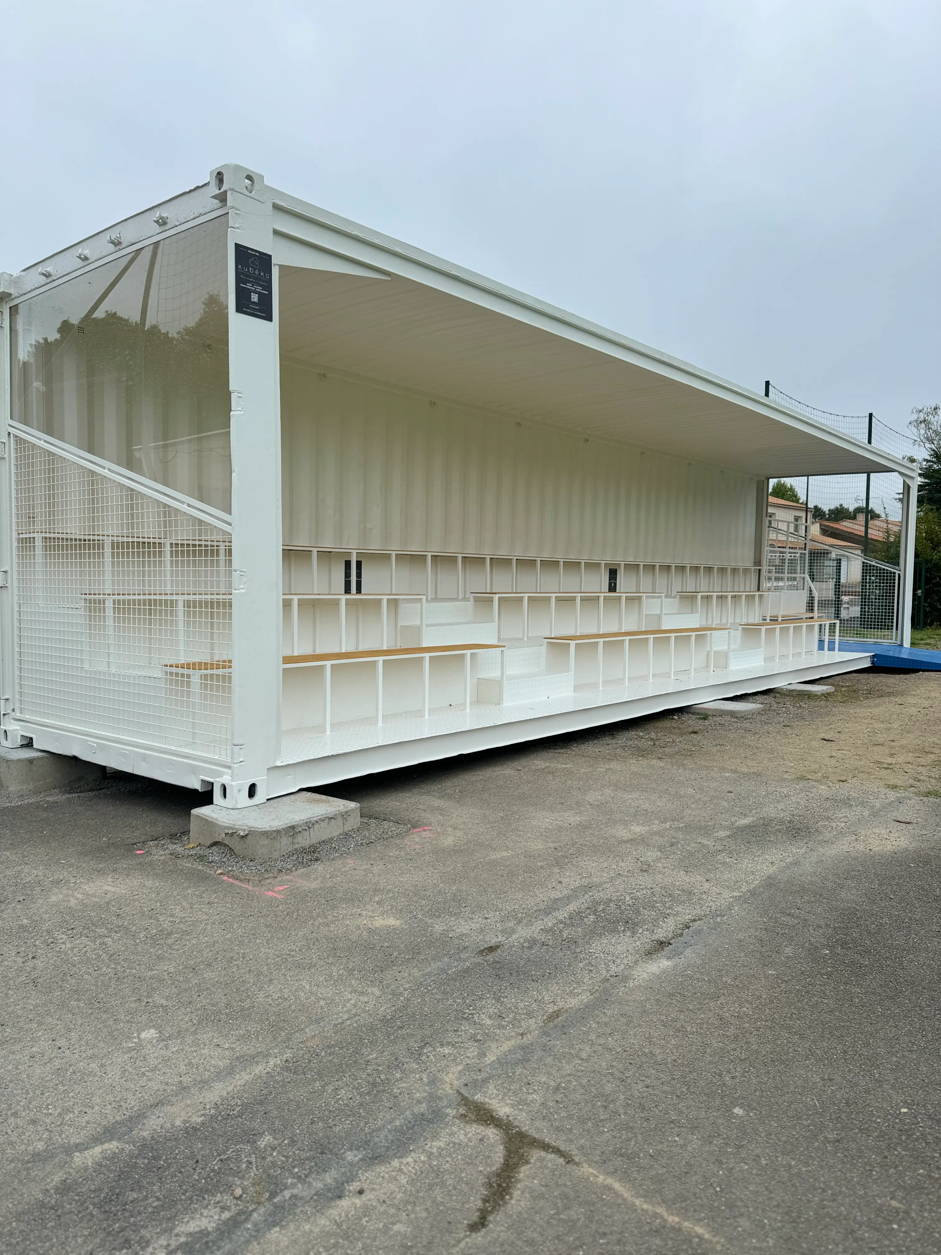 À partir d’un conteneur maritime 40 pieds High Cube, nous avons conçu des tribunes. Ce projet, pensé pour offrir une solution d’accueil du public à la fois robuste, sécurisée et modulable, permet de créer rapidement des gradins adaptés aux événements sportifs, culturels ou institutionnels, tout en respectant les normes en vigueur en matière de sécurité et d’accessibilité.
