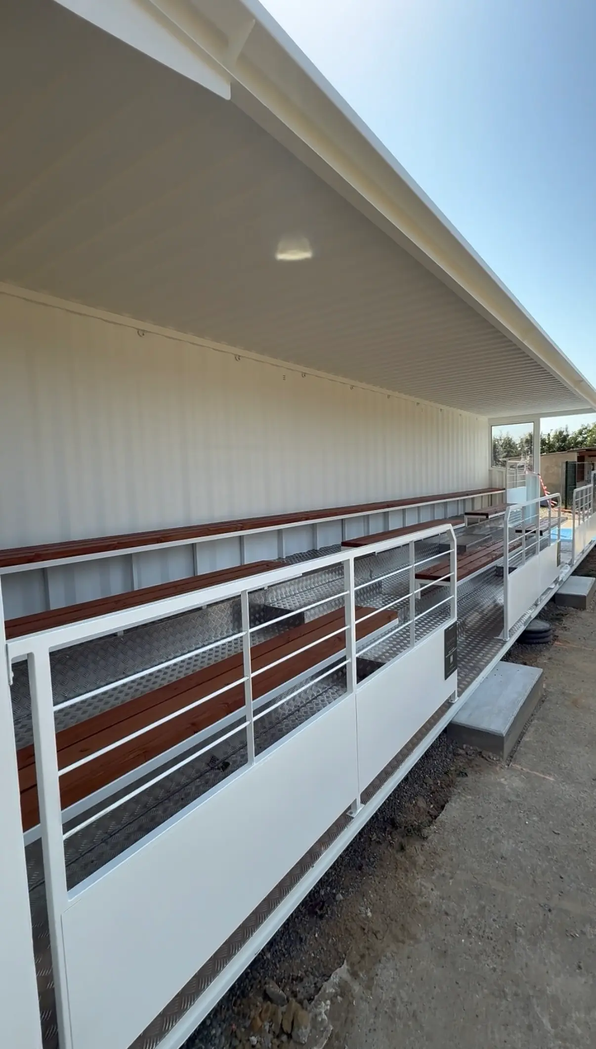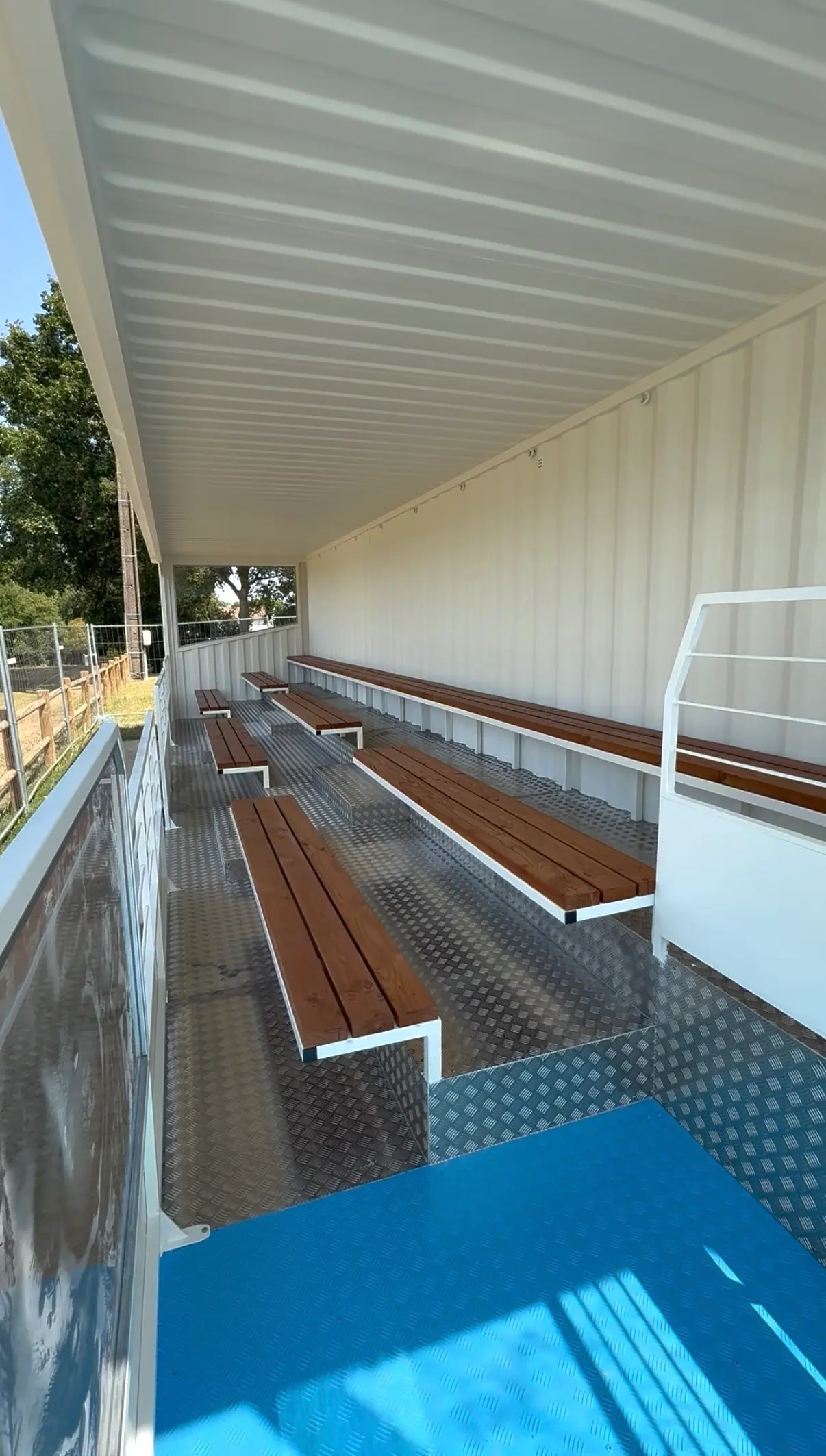 Nous avons conçu et livré une tribune réalisée à partir d’un container maritime de 40 pieds, mesurant 12,19 m de long pour 2,44 m de large et 2,90 m de haut. Cette structure offre une solution robuste, durable et parfaitement adaptée à l’accueil du public lors des rencontres sportives. Le container tribune s’intègre harmonieusement à l’environnement du stade tout en garantissant stabilité et sécurité.